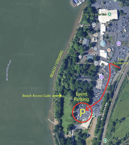 Fortunately the amusement park doesn’t open until noon. Here’s a bird’s eye view of the Oaks Park property with red arrows directing you to our designated parking area and beach access. UPDATE: REGISTRATION IS ON THE BEACH BELOW THE PARK!!! The beach access is thru a chain link gate west of the parking lot.